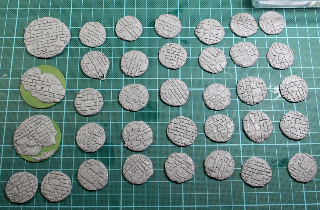 Das Endergebnis waren knapp zwei Dutzend 25mm Rundbases und ein paar 40mm Bases. Das Ganze wurde für 24 Stunden aushärten lassen und danach die Ränder mit einem scharfen Messer und einer Feile gesäubert. Bei manchen Bases habe ich die Ecken frei gelassen um sie mit Sand und Geröll zu gestalten.