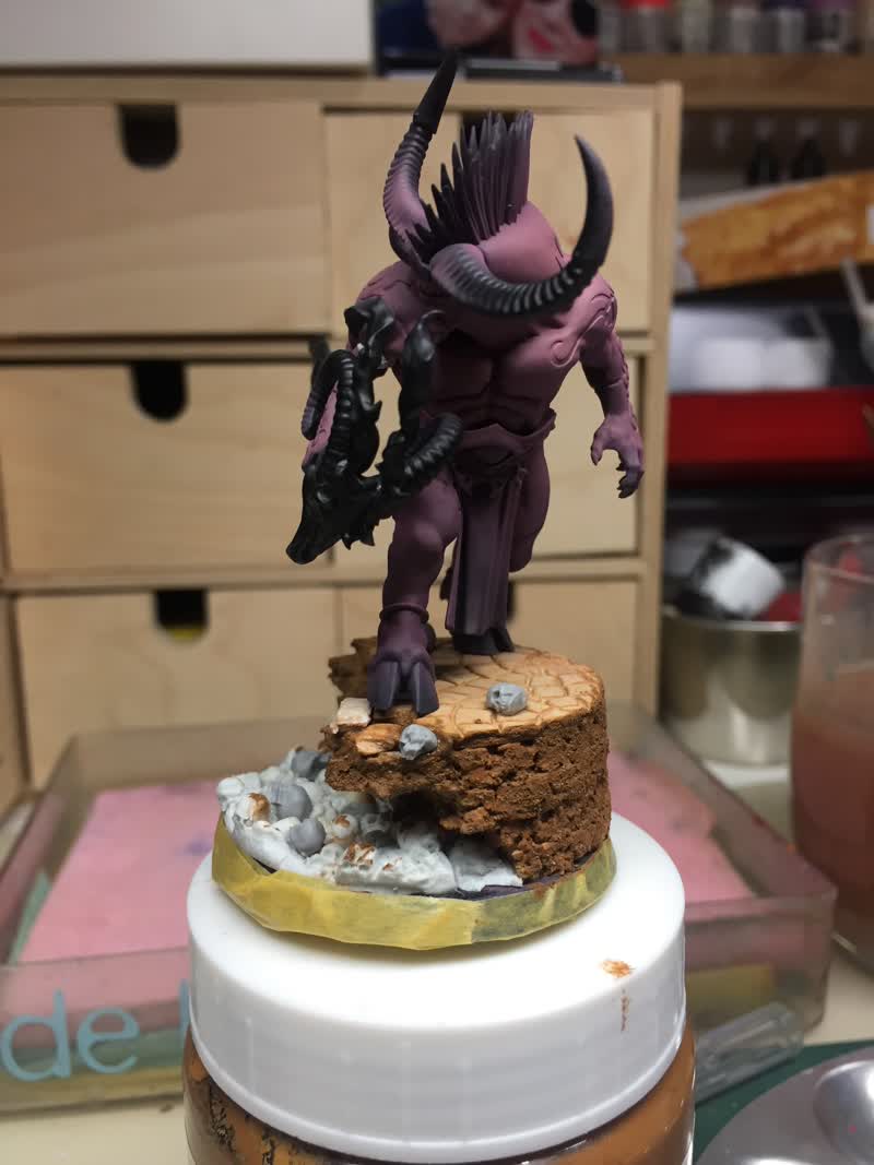 Pegamos la pieza de resina y una de corcho, posteriormente vamos añadiendo capas hasta lograr la altura deseada, por ultimo con una pieza modelada con un rulo de la marca Green stuff, realizamos la misma operación y la pegamos encima.