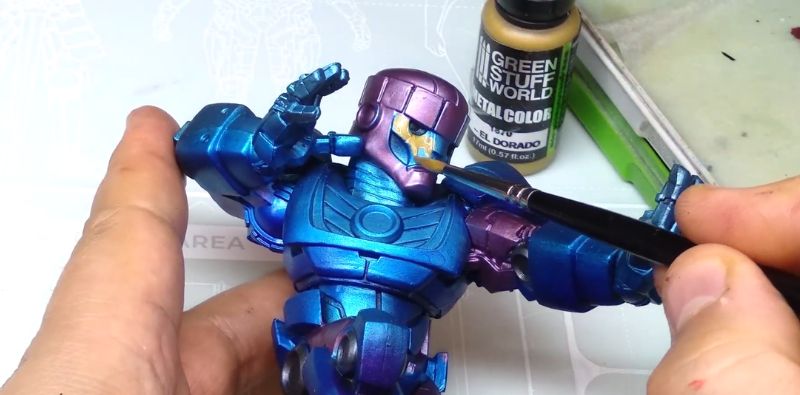 También hay que recordar que el brillo puede reducirse si aplicas demasiados lavados opacos encima. A veces interesa porque ayuda a envejecer el metal. Otras, en cambio, conviene recuperar el reflejo con un último toque de color metálico en las zonas altas.
